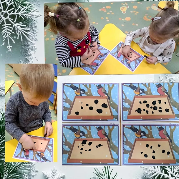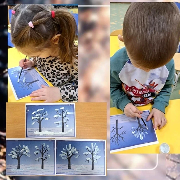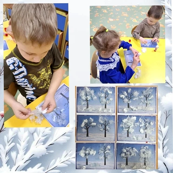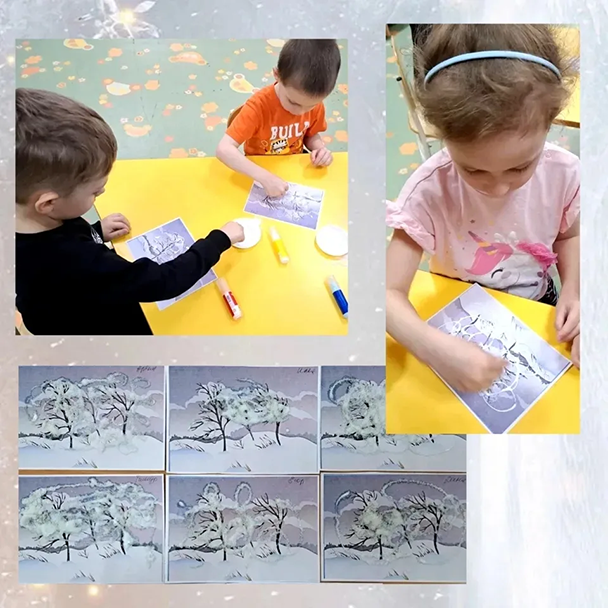 Малыши 2-3 лет рисовали ватными палочками "Снегопад", лепили зе́рна для птиц на тему"Покормите птиц зимой".Ребята 3-4 лет выполнили аппликацию с фольгой "Ледяная горка", рисовали гуашью "Деревья в снегу".