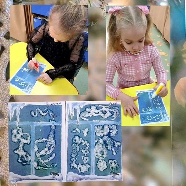 Воспитанники 4-5 лет создавали образ "Деревьев в снежных шубах" с помощью клея и ваты, рисовали клеем и солью "Вьюгу-завируху". Дошкольники 6-7 лет рисовали "Зимние узоры на окне", используя клей и соль.Только посмотрите, какие прекрасные работы получились у наших ребят!